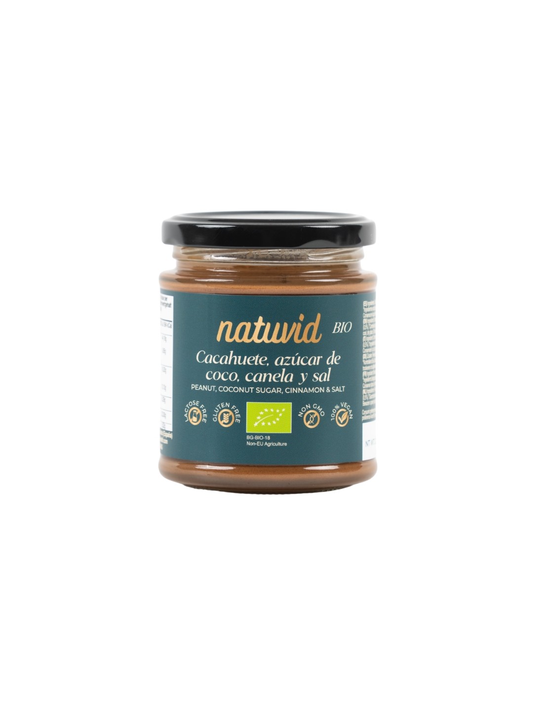 Crema de Cacahuete, azúcar de Coco, Canela y Sal, BIO, 200 gramos - Natuvid
