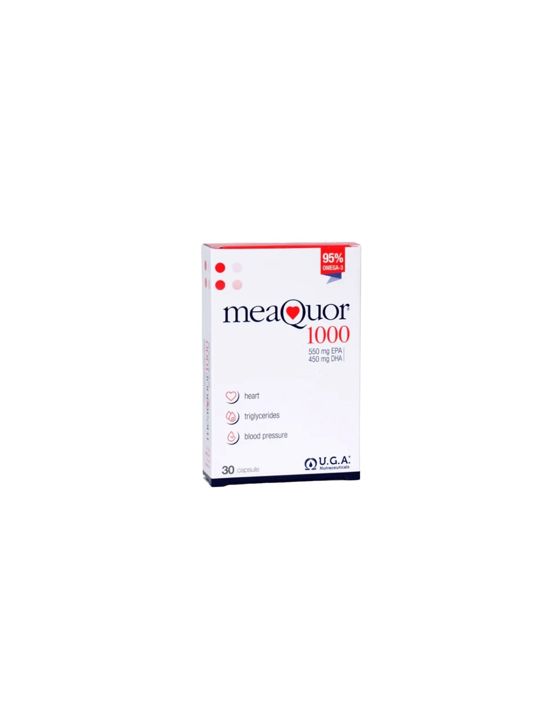 EPA y DHA contribuyen a la función cardíaca normal con una ingesta diaria de 250 mg (1 cápsula blanda de Meaquor 1000)*, contribuyen, en la población adulta, a mantener niveles normales de triglicéridos en sangre con una ingesta diaria de 2 gramos (2 cápsulas blandas de Meaquor 1000)** y contribuyen a mantener la presión arterial normal con una ingesta diaria de 3 gramos (3 cápsulas blandas de Meaquor 1000)**.