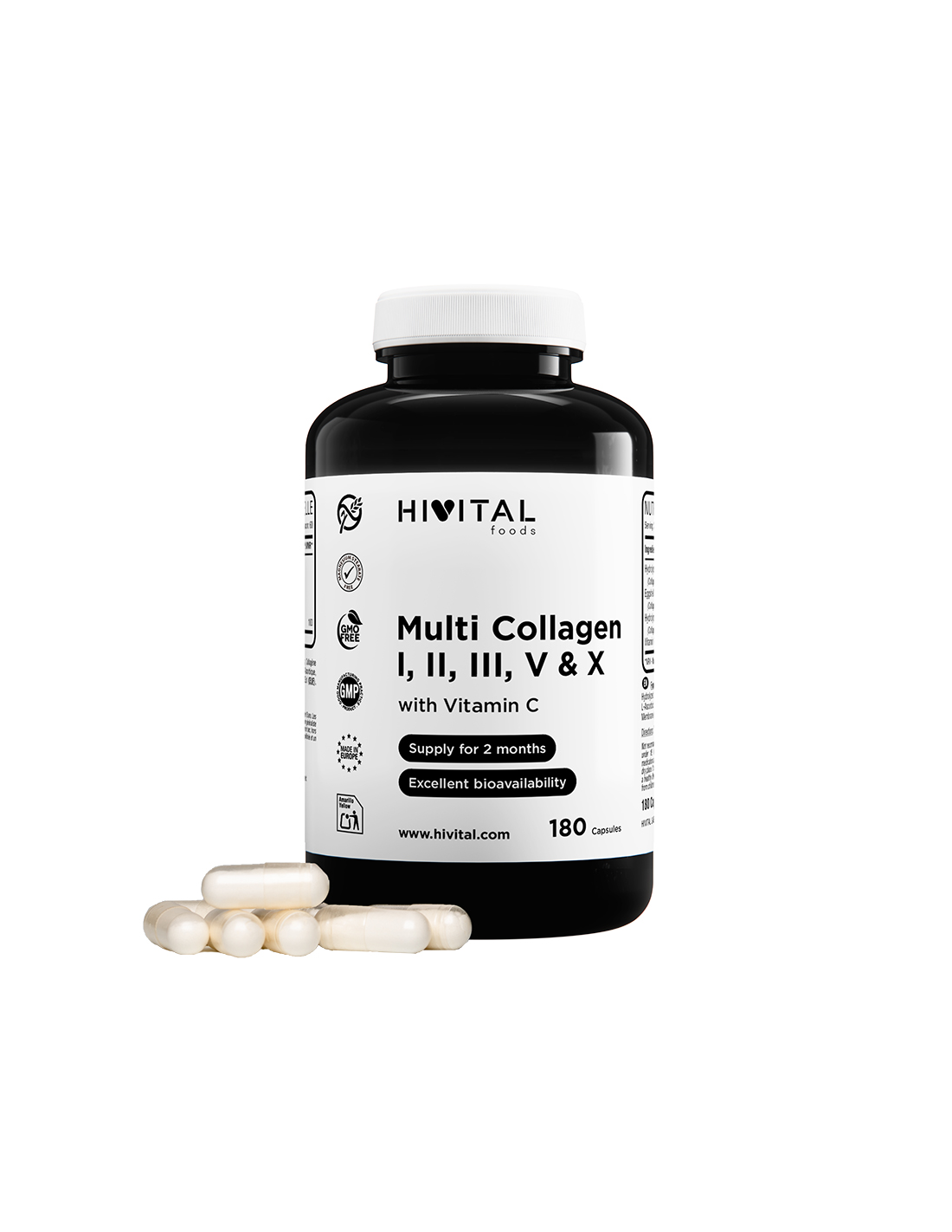 Multi Colágeno, (I,II,III,V & X), con Vitamina C, 180 cápsulas - Hivital.
