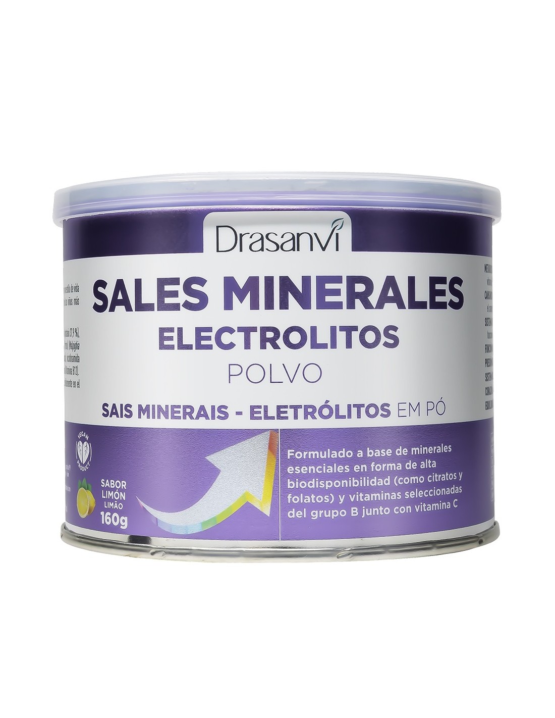 Electrolitos - Sales Minerales 160 mg Drasanvi con aroma de limón: combina una avanzada fórmula de minerales esenciales en formas de alta biodisponibilidad, (como citratos y fosfatos) y un completo complejo vitamínico (B1, B3, B5, B12 y C), con un refrescante toque de limón.