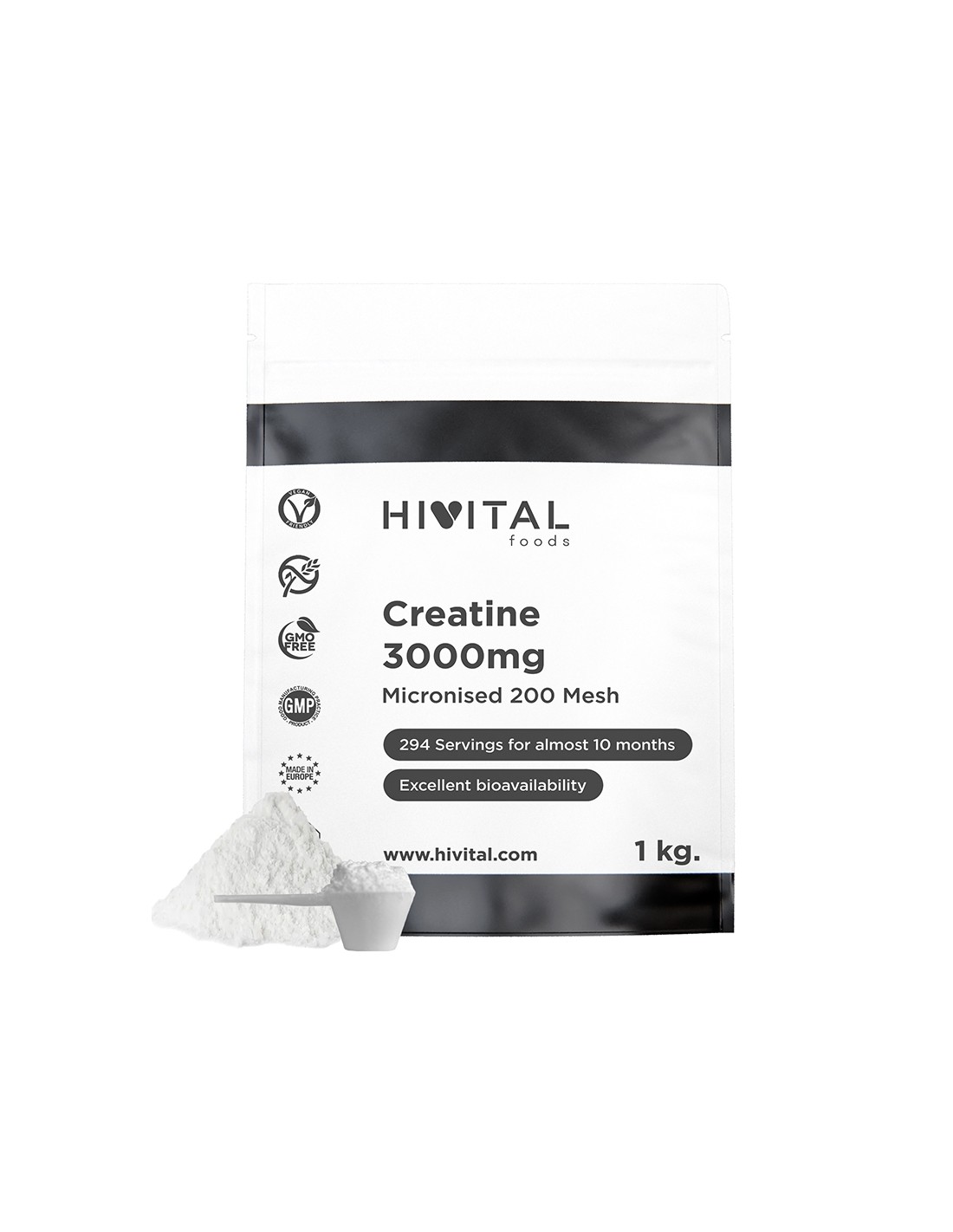 Creatina, 3000mg, Monohidratada, sin gluten, Vegana, 200 mesh, 1kg - Hivital