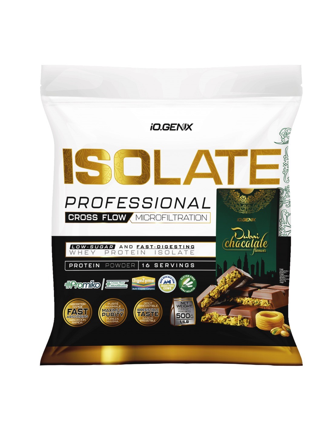 Proteína Isolatada, sabor Chocolate de Dubai, 500 gramos - Iogenix.