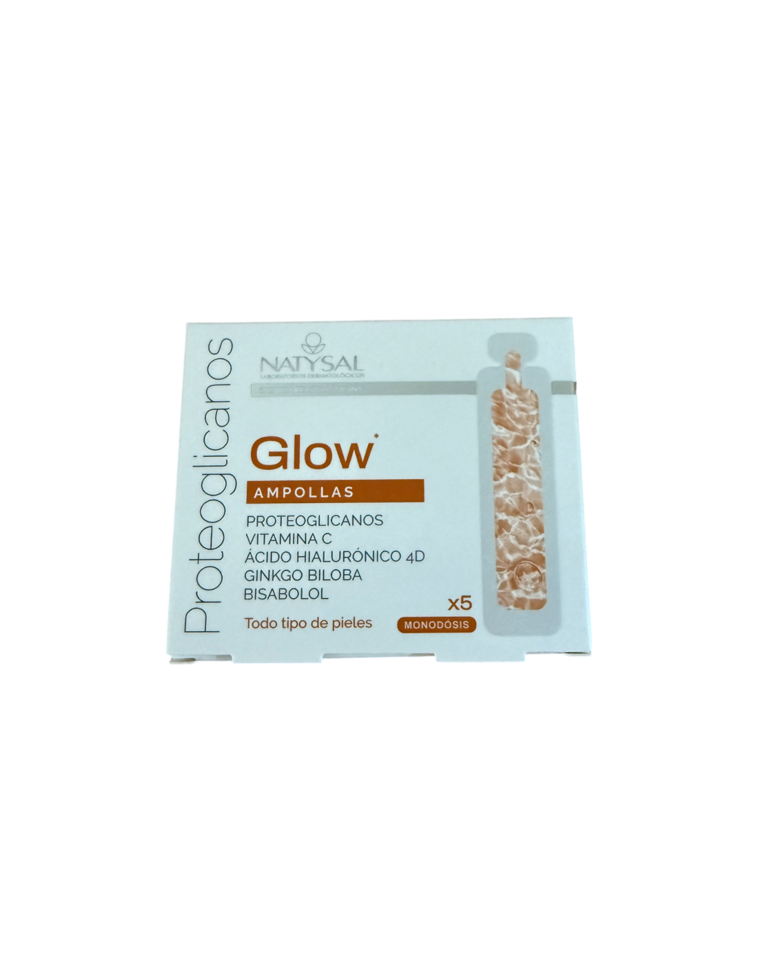 Ampollas, Glow ( Proteoglicanos, Vit C, Ácido Hilaurónico, Ginkgo Biloba y Bisabolol), 5 monodosis, 5 ml, Natysal